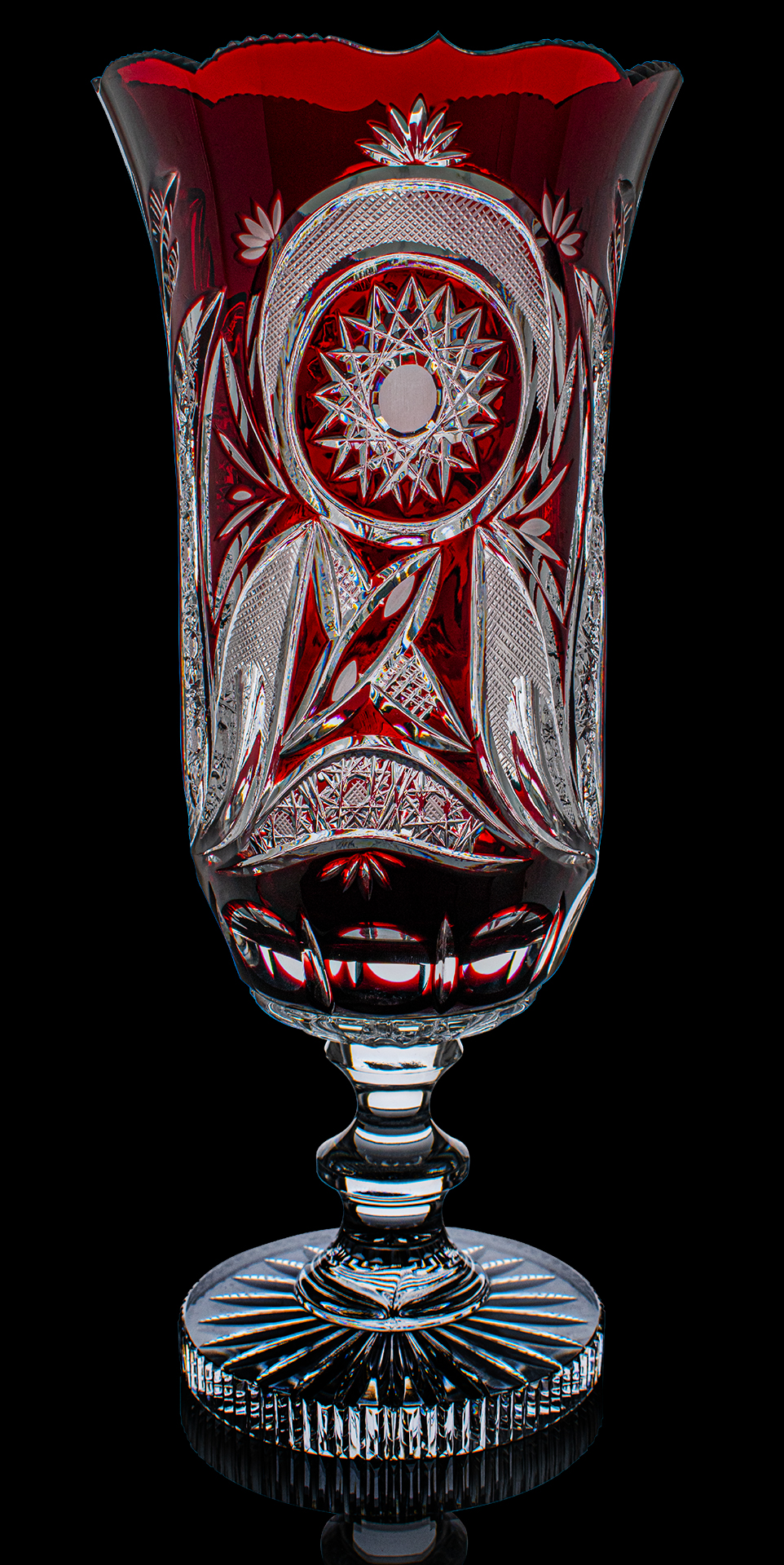 30 cm tall with 13 cm diameter. The vase shape resembles to a beer glass: Narrow bottom, diameter is expanding upwards, and at the top , it is bending inside. It has individual chiselling: From the bottom to the top arched cuts, with matte saturation, implied 16 edged baccarat stars, and with palms between them . Brim is decorated, and there is a chance to engrave it, between the upper part , and the brim.